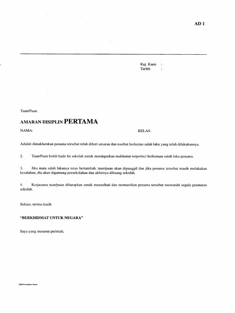 Surat ini adalah dirujuk kepada mesyuarat tergempar yang diadakan pada 10 oktober 1988 mengenai isu kelewatan anda. Tidak hadir sekolahlater head sekolah. Amaran pertama / keduasaya dengan ini .